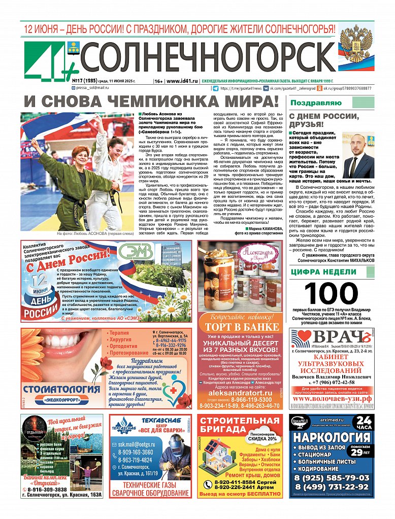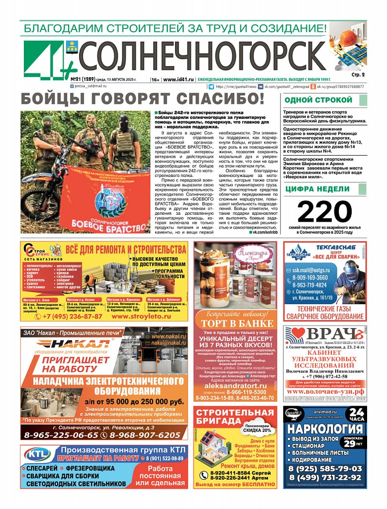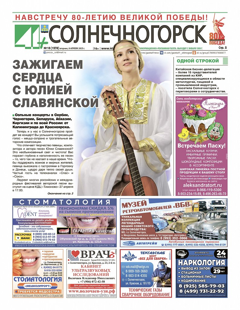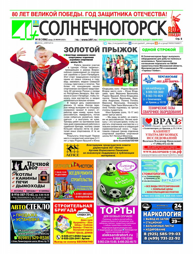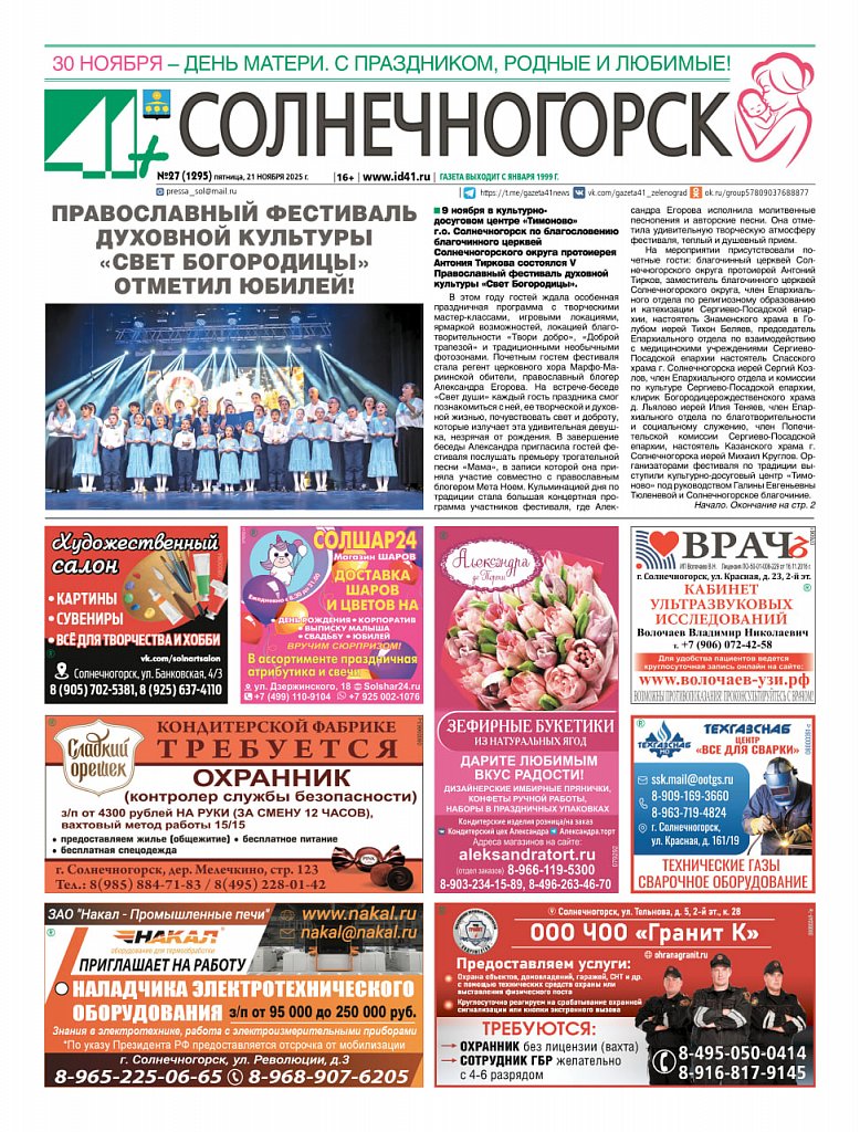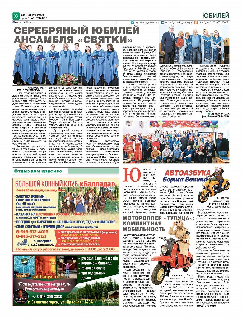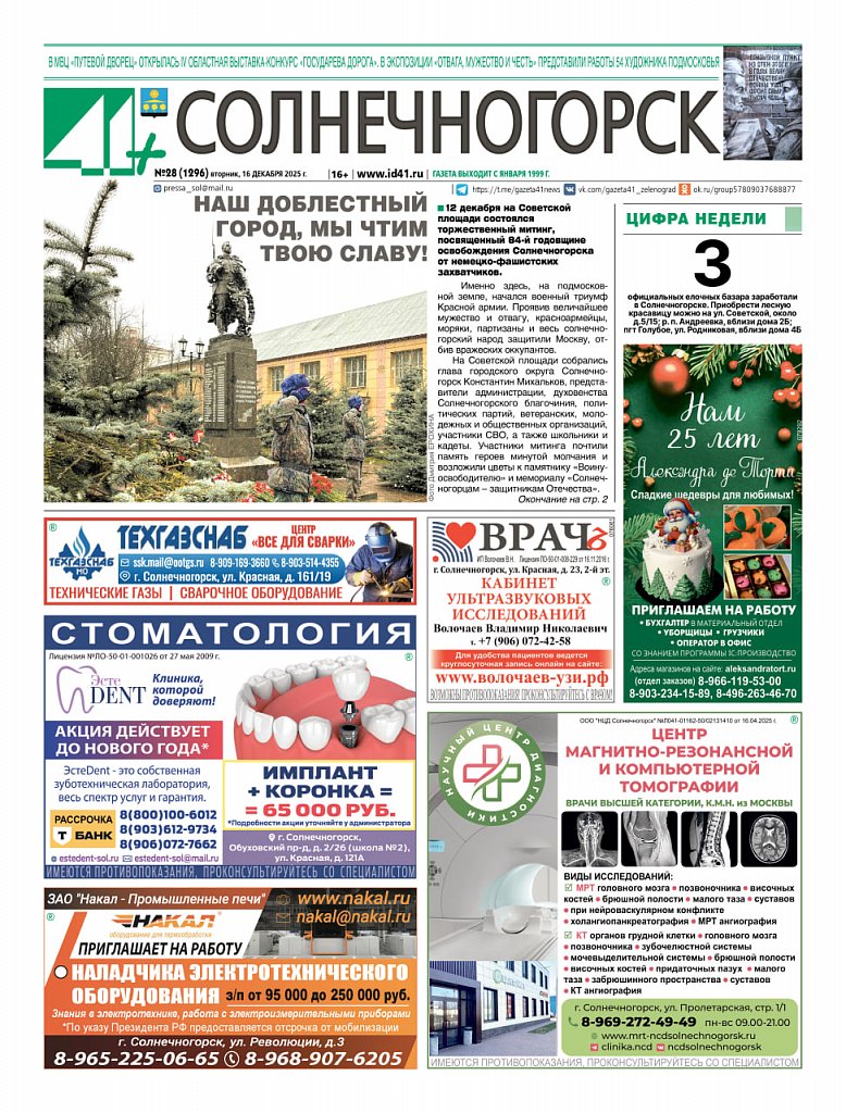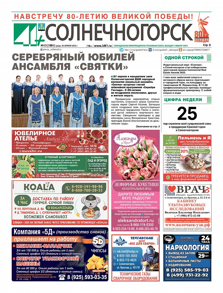 Газета "41 + Солнечногорск" издается с января 1999 года. На протяжении всего этого времени жители Солнечногорского района получают оперативную информацию из первых рук от Администрации района, городских и сельских поселений, социальных служб Солнечногорского района. Газета рекламно- информационная выходит каждый вторник и распространяется бесплатно во все почтовые ящики Солнечногорска, а так же в городских и сельских поселениях Солнечногорского района.