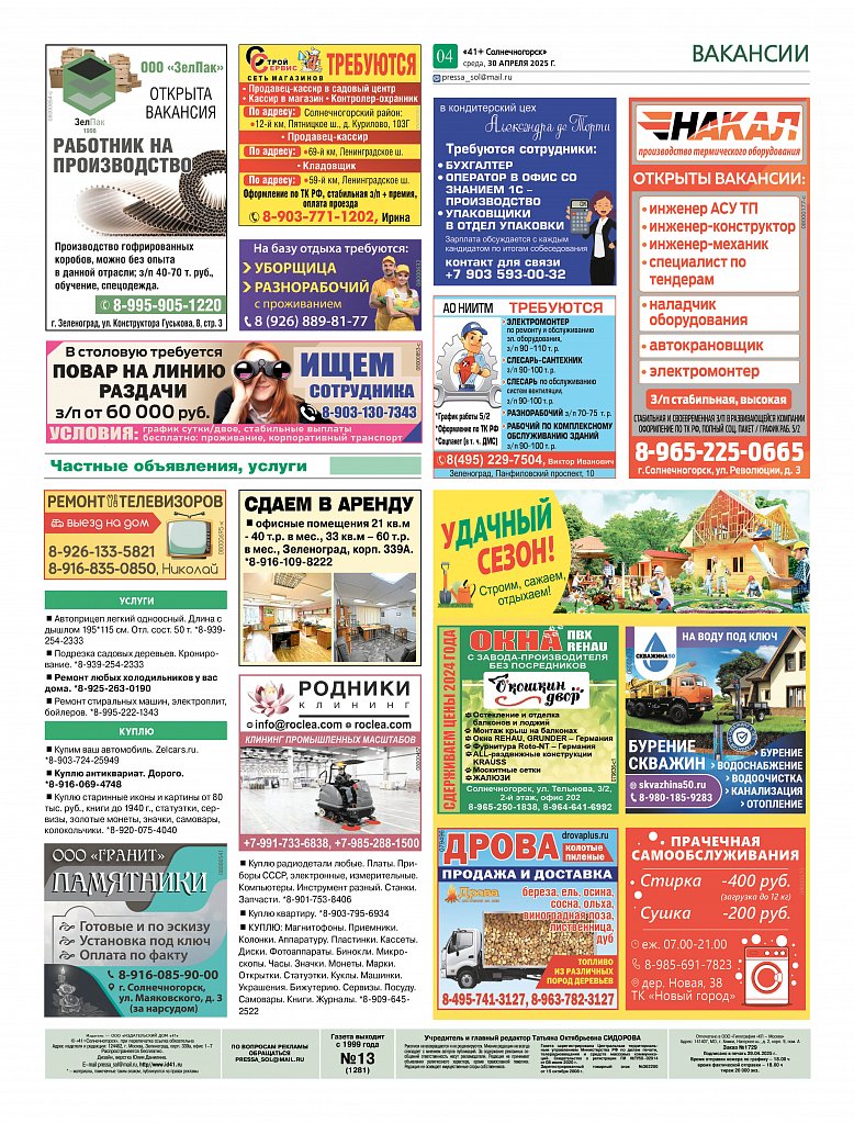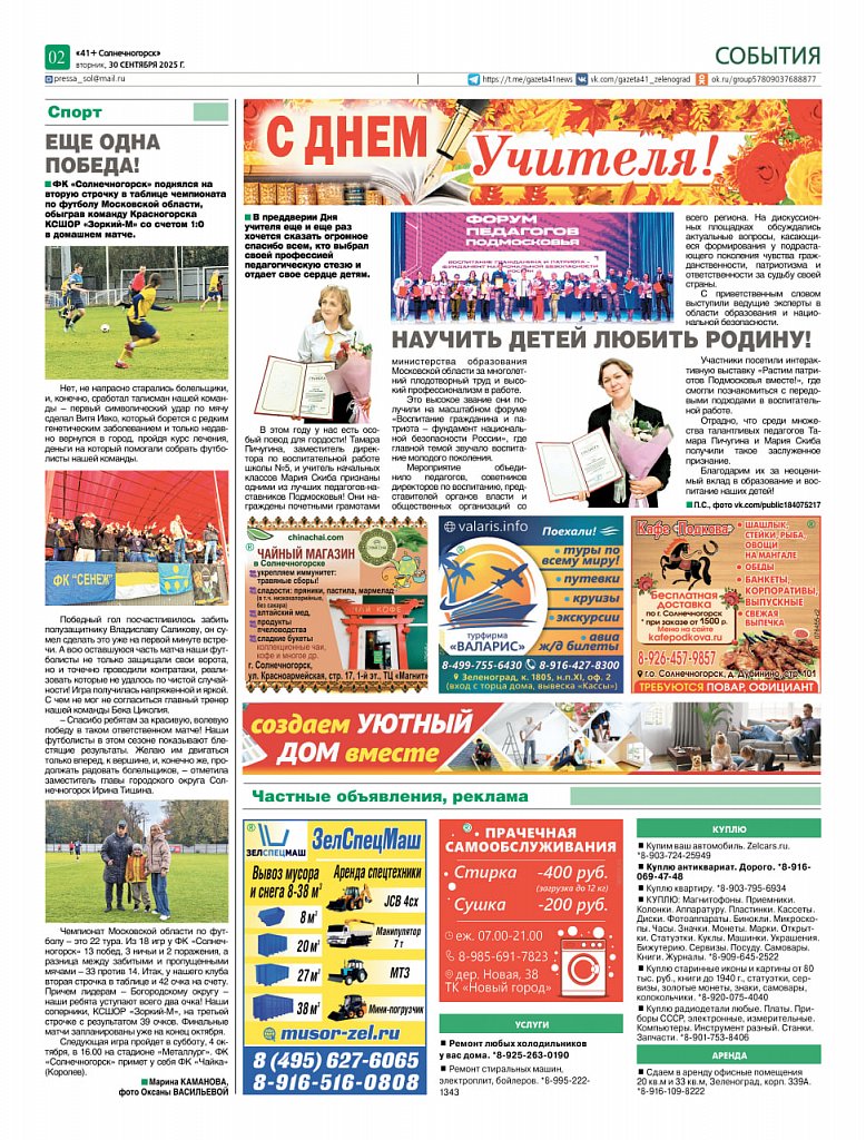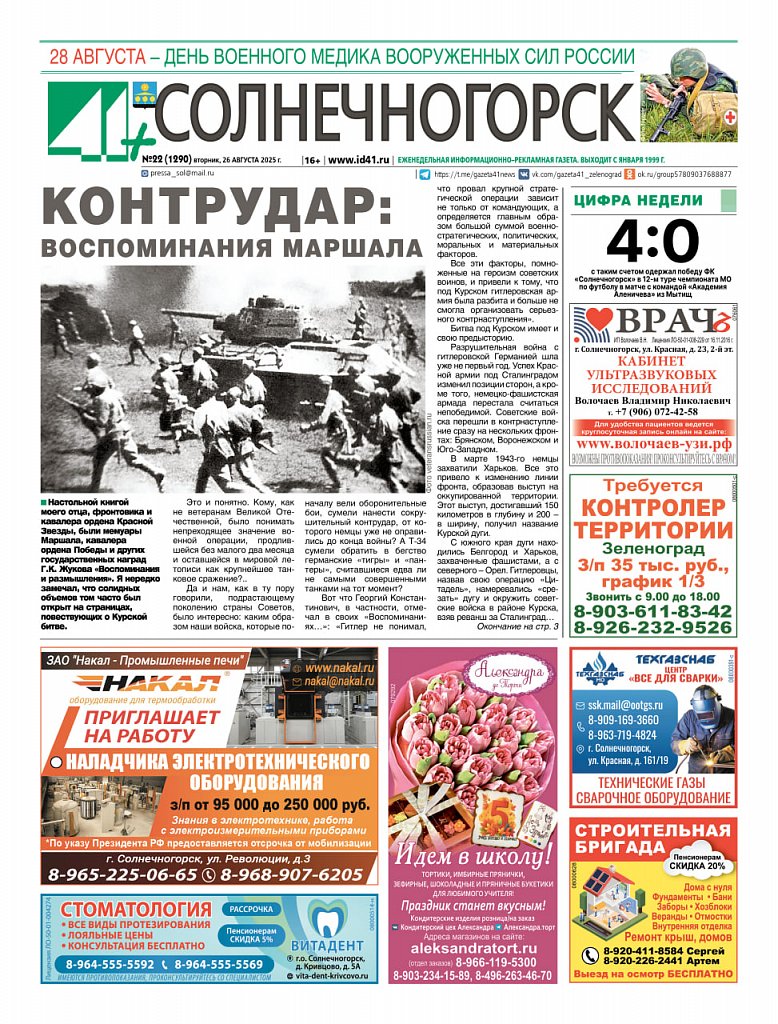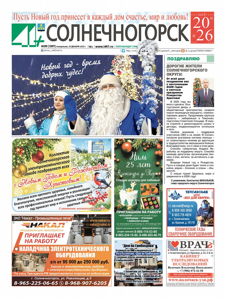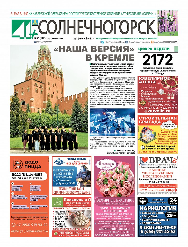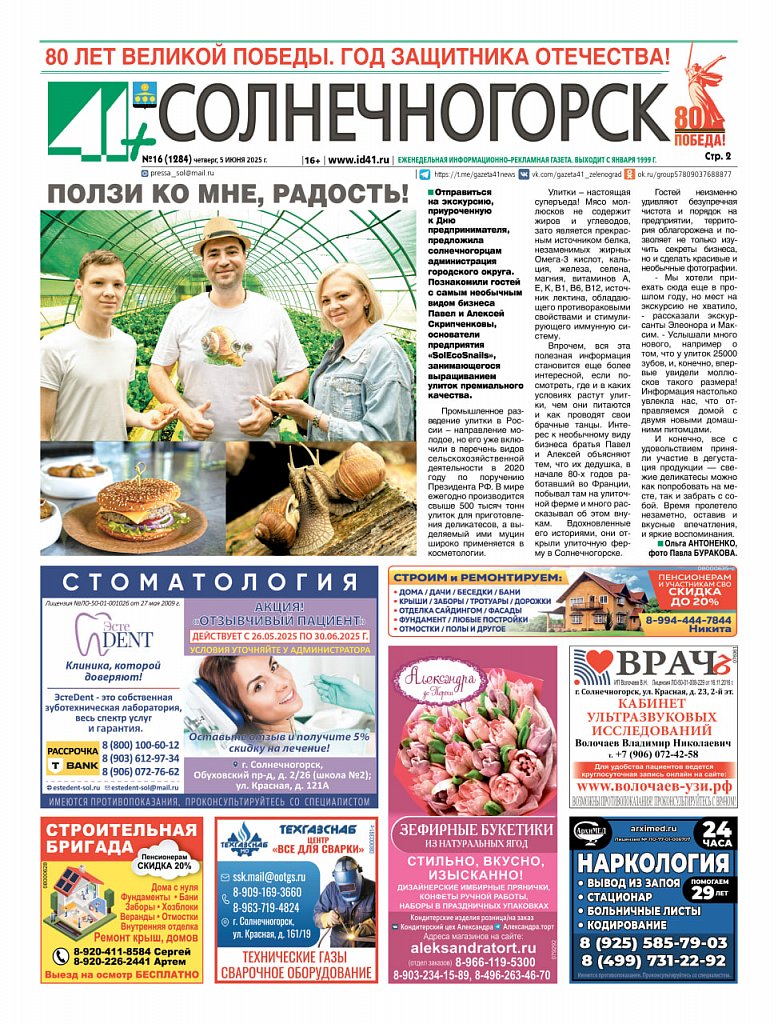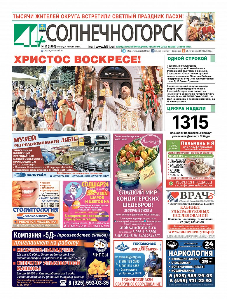 Газета "41 + Солнечногорск" издается с января 1999 года. На протяжении всего этого времени жители Солнечногорского района получают оперативную информацию из первых рук от Администрации района, городских и сельских поселений, социальных служб Солнечногорского района. Газета рекламно- информационная выходит каждый вторник и распространяется бесплатно во все почтовые ящики Солнечногорска, а так же в городских и сельских поселениях Солнечногорского района.