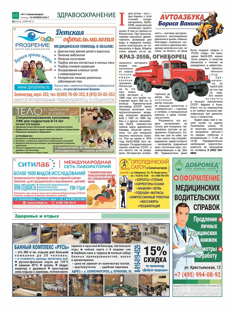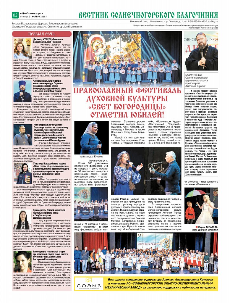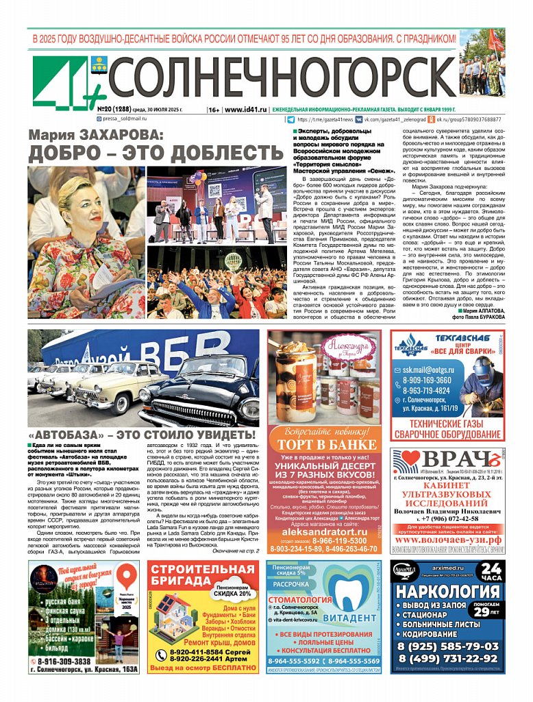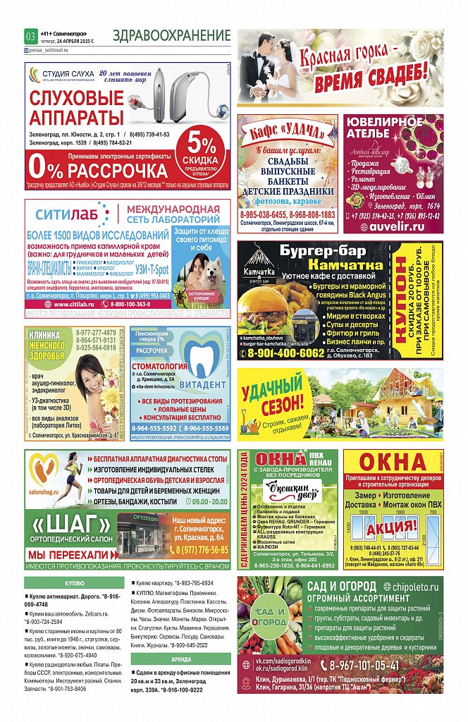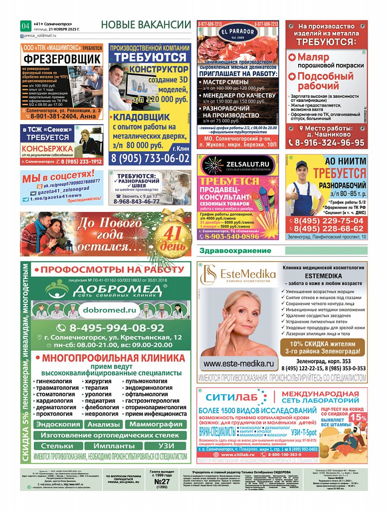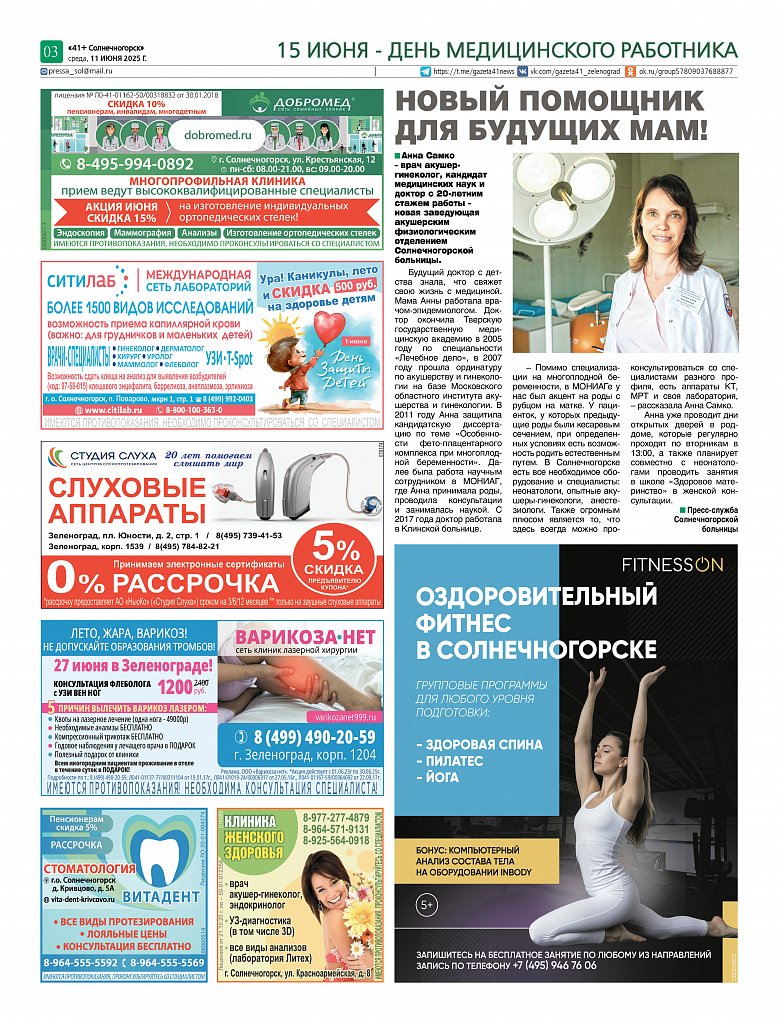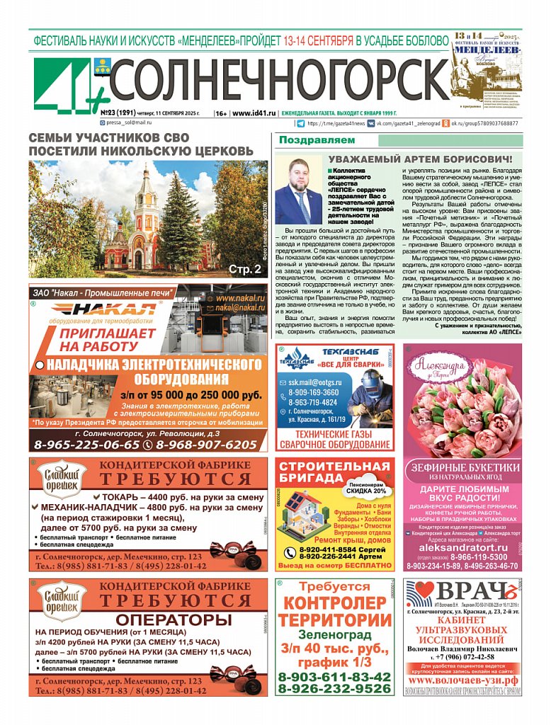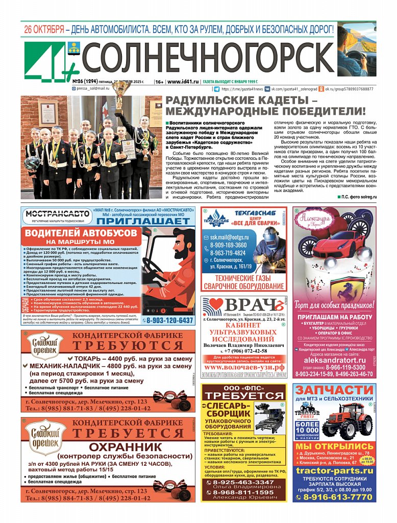 Газета "41 + Солнечногорск" издается с января 1999 года. На протяжении всего этого времени жители Солнечногорского района получают оперативную информацию из первых рук от Администрации района, городских и сельских поселений, социальных служб Солнечногорского района. Газета рекламно- информационная выходит каждый вторник и распространяется бесплатно во все почтовые ящики Солнечногорска, а так же в городских и сельских поселениях Солнечногорского района.