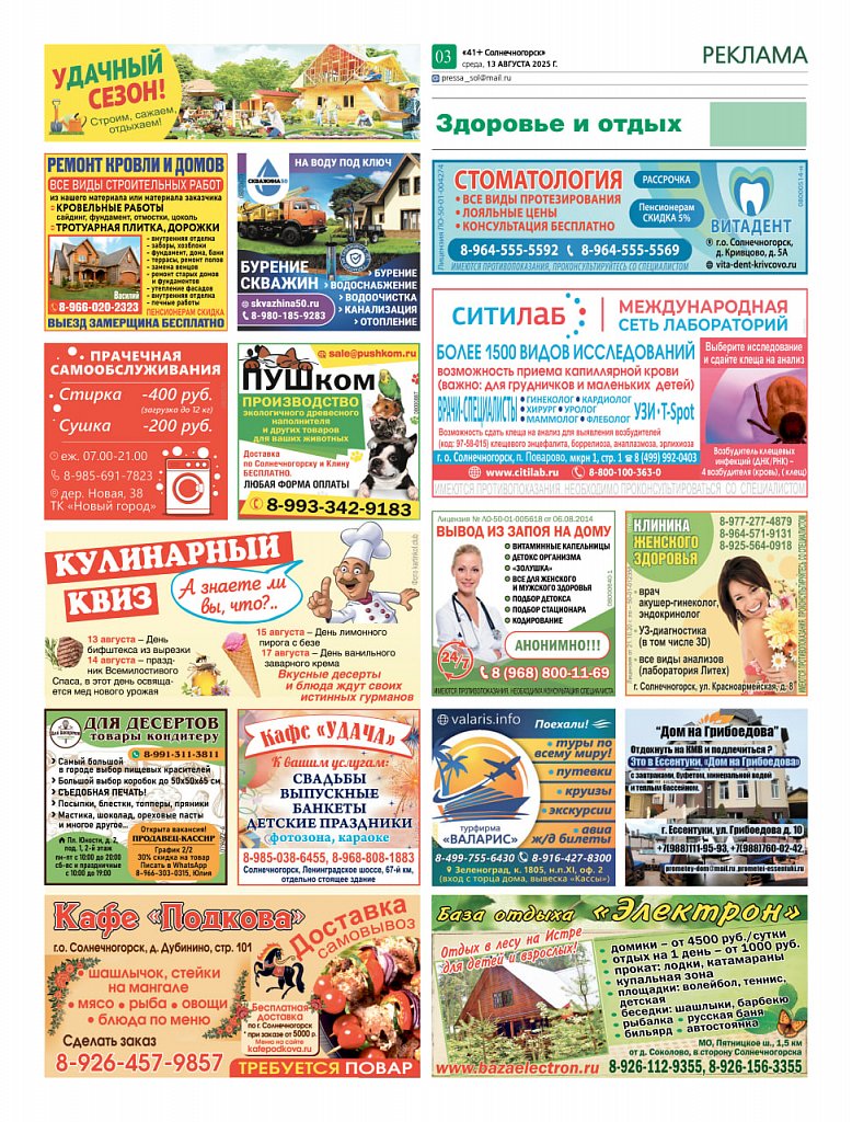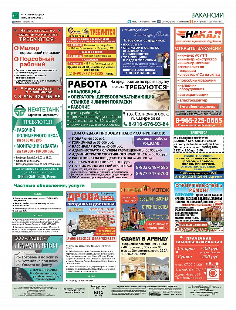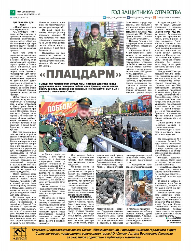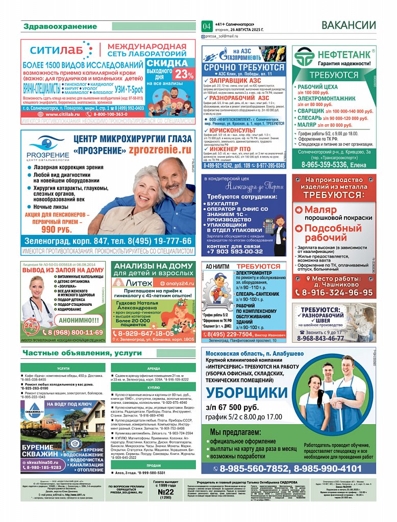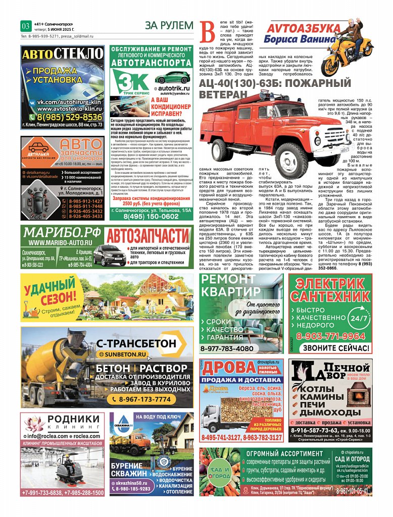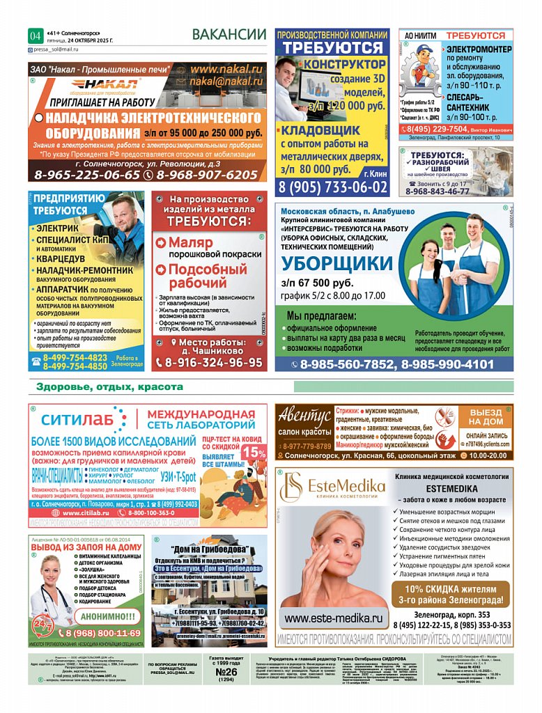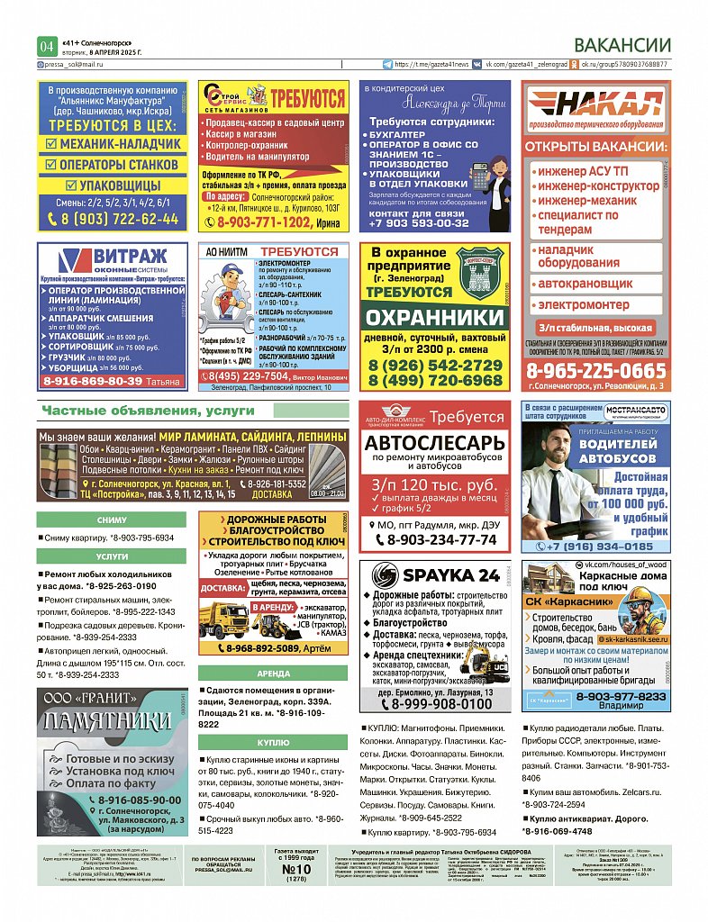 Газета "41 + Солнечногорск" издается с января 1999 года. На протяжении всего этого времени жители Солнечногорского района получают оперативную информацию из первых рук от Администрации района, городских и сельских поселений, социальных служб Солнечногорского района. Газета рекламно- информационная выходит каждый вторник и распространяется бесплатно во все почтовые ящики Солнечногорска, а так же в городских и сельских поселениях Солнечногорского района.