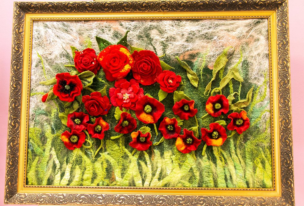 Что касается работ участниц класса мокрого валяния из шерсти преподавателя и большого мастера своего дела Елены Глазковой, то и здесь кроме восторженных слов трудно передать свои впечатления от увиденного. Глядя на панно с цветами, невозможно поверить, что все это сотворено руками начинающих учениц, настолько натурально они выглядят.