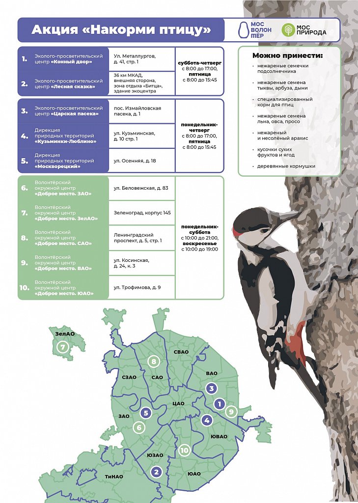 Москвичей приглашают присоединиться к экологической акции «Накорми птицу», она продлится до 31 января. Ее организатором выступает ресурсный центр «Мосволонтер» при поддержке ГПБУ «Мосприрода». Каждый желающий может передать угощения для пернатых или кормушку в любой из 10 пунктов сбора либо воспользоваться боксами акции для волонтеров штаба Международной выставки-форума «Россия» на ВДНХ. Поддержка зимующих в столице пернатых — важная часть сохранения экологии города. Биоразнообразие и популяция птиц напрямую влияют на формирование и развитие экосистемы Москвы. В пунктах сбора принимают специализированный корм для птиц, нежареные семена подсолнечника, тыквы, арбуза, дыни, льна, проса, овса, трав и сорняков, шишки хвойных деревьев, нежареный и несоленый арахис, кусочки сухих фруктов и ягод. Кроме того, можно передать кормушки из дерева или из съедобных материалов, например из зерновых смесей и хлебцев. Организаторы планируют собрать не менее 200 килограммов угощений для зимующих птиц. Гостинцы, кормушки и домики от жителей столицы помогут пернатым перезимовать. В прошлом году в рамках акции «Накорми птицу» горожане передали 210 килограммов корма (подсолнечные семечки, семена тыквы и льна, специализированные смеси для птиц), а также 200 домиков из дерева и съедобных материалов. Тогда сбор вели на 18 площадках, в нем приняло участие 10 образовательных организаций. Для участников акции провели пять мастер-классов по изготовлению кормушек. Все, что передали жители столицы, поступило в отделения Мосприроды и было распределено по природным территориям. С понедельника по субботу с 10:00 до 21:00 и в воскресенье с 10:00 до 19:00 угощения и кормушки можно принести в волонтерские окружные центры «Доброе место» по адресам: — Зеленоград, корпус 145 (ЗелАО); — Косинская улица, дом 24, корпус 3 (ВАО); — улица Трофимова, дом 9 (ЮАО); — Беловежская улица, дом 83 (ЗАО); — Ленинградский проспект, дом 5, строение 1 (САО). Структурные подразделения «Мосприроды» принимают корма, кормушки и птичьи домики с понедельника по четверг с 08:00 до 17:00 и в пятницу с 08:00 до 15: 45 по адресам: — эколого-просветительский центр «Царская пасека», поселок Измайловская Пасека, дом 1 (ВАО); — дирекция природной территории «Кузьминки-Люблино», Кузьминская улица, дом 10, строение 1 (ЮВАО); — дирекция природной территории «Москворецкий», Осенняя улица, дом 18 (ЗАО). Кроме того, в те же часы подарки горожан примут сотрудники эколого-просветительских центров «Конный двор» (улица Металлургов, дом 41, строение 1) и «Лесная сказка» (36-й километр МКАД, внешняя сторона, зона отдыха «Битца»). Присоединиться к акции могут гости штаба волонтеров Международной выставки-форума «Россия» на ВДНХ. Он открыт по адресу: проспект Мира, дом 119, павильон 38 «Бизнес. Техноград». Боксы для приема угощений и домиков для птиц находятся возле стойки ресепшена, ими можно воспользоваться со вторника по воскресенье с 09:00 до 22:00. Больше о добровольческих инициативах можно узнать на сайте ресурсного центра «Мосволонтер», на странице в социальной сети «ВКонтакте» и в телеграм-канале. Фото: mos.ru«Забота о пушистых, четвероногих, пернатых — это одно из важных ежедневных добрых дел волонтеров. Сегодня помощь животным вместе с нами выбирают более 12,8 тысячи человек. Один из самых популярных видов поддержки в зоонаправлении — сбор товаров д
