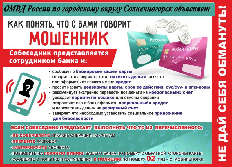 Сотрудники полиции напоминают жителям городского округа Солнечногорск! Если вам позвонит неизвестный, который представится сотрудником службы безопасности банка и:
