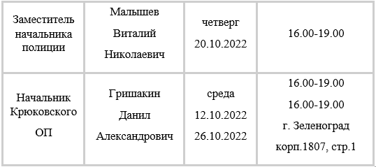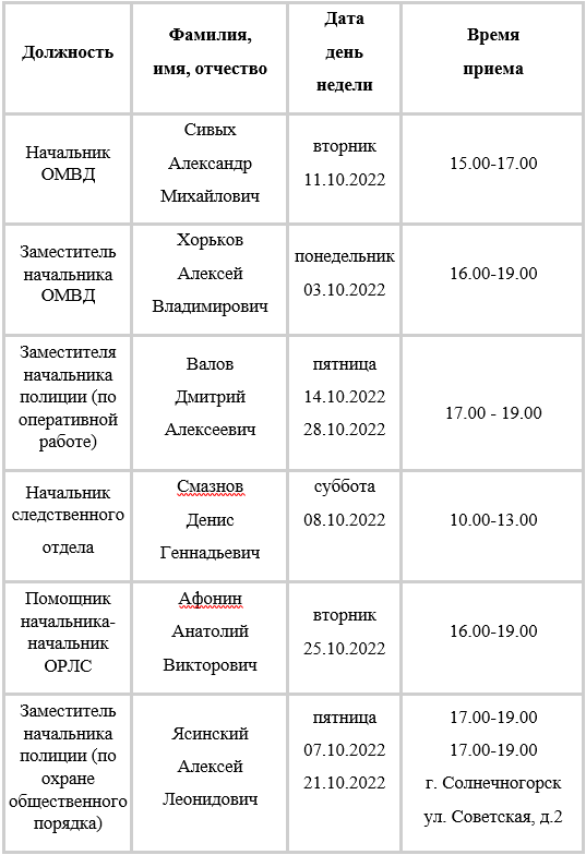 Прием осуществляется должностные лица ОМВД России по городскому округу Солнечногорск по вопросам, относящимся к их компетенции по предварительной записи, согласно утвержденному графику.