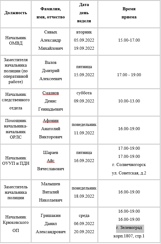 Прием осуществляется должностные лица ОМВД России по городскому округу Солнечногорск по вопросам, относящимся к их компетенции по предварительной записи, согласно утвержденному графику.