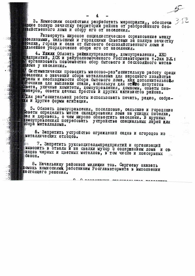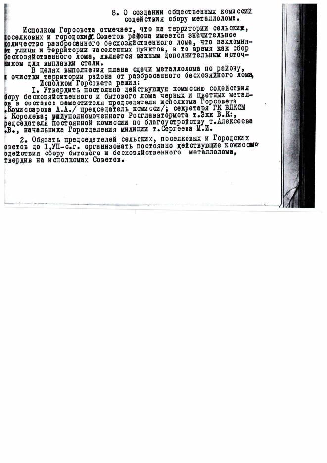 В СССР сбор металлолома был делом государственной важности. В нашем архиве сохранился протокол №24 заседания исполнительного комитета Солнечногорского городского Совета депутатов трудящихся от 15 июня 1962 года, где рассматривался вопрос «О создании общественных комиссий содействия сбору металлолома» (Примечание архива: из оригинального текста). Исполком отмечает, что на территории района имеется значительное количество разбросанного бесхозного металлолома, что захламляет улицы и территории населенных пунктов. На заседании акцентируется особое внимание на то, что сбор лома является важным дополнительным источником сырья для выплавки стали. В целях выполнения плана сдачи металлолома по району и очистки территорий от лома Исполком утвердил комиссию, которая оказывала содействие в сборе бесхозного и бытового лома черных и цветных металлов. Подобные комиссии следовало организовать при сельских, поселковых и городских Советах. Комиссии должны были разработать план мероприятий, обеспечивающих полную зачистку территории района от бесхозного лома. Рекомендовалось развернуть широкое социалистическое соревнование между поселковыми, сельскими и городскими Советами. Райжилуправление, домоуправления, ЖКО предприятия, ДСК должны были организовать повсеместный сбор бытового лома у населения. Депутаты Совета, уличные комитеты, домоуправления, домкомы, советы пенсионеров, советы дачных трестов и другие активисты района должны были систематически проводить массово-разъяснительную работу среди населения. Для такой работы рекомендовалось широко использовать печать, радио, собрания и другие формы агитации. Необходимо было определить места для складирования лома на улицах поселков, сел и деревень, а в крупных домоуправлениях установить специальные лари для сбора металлолома. Исполком запретил вывозить металлолом на свалки, нельзя было использовать металлические отходы для ограждения садов и огородов. Начальника районной милиции обязали оказывать помощь работникам Росглаввтормета в выполнении настоящего решения.