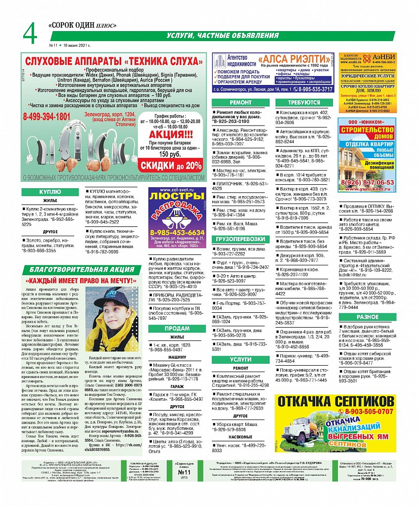 Рекламно-информационная газета Зеленограда «41 плюс» издается с 1990 года и распространяется бесплатно во все почтовые ящики города. Газета содержит полезные для жителей статьи, блочную рекламу, строчные объявления, афишу мероприятий, информацию о телефонах служб города и власти.