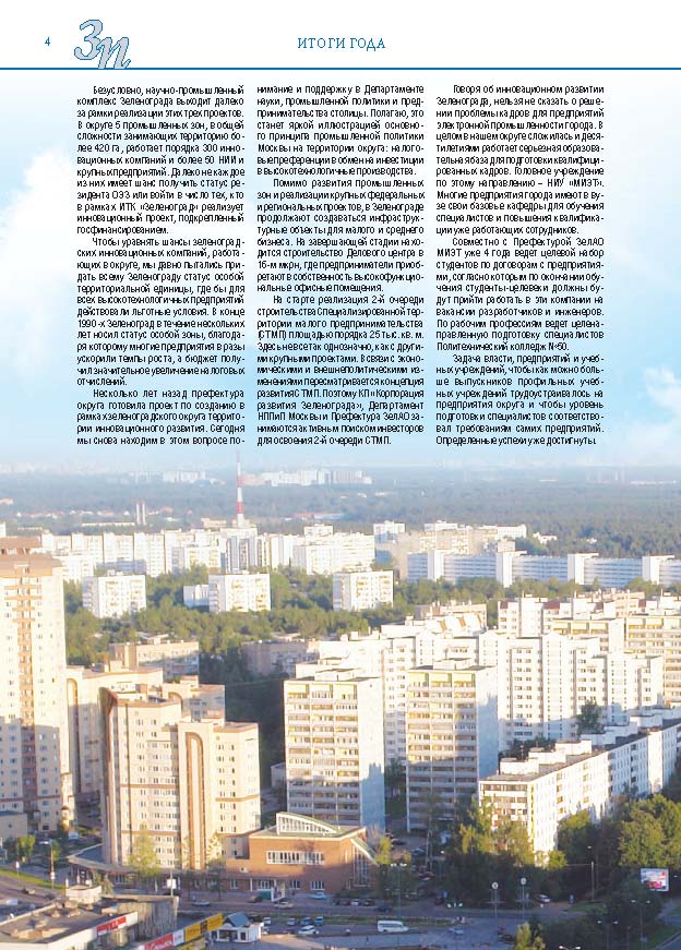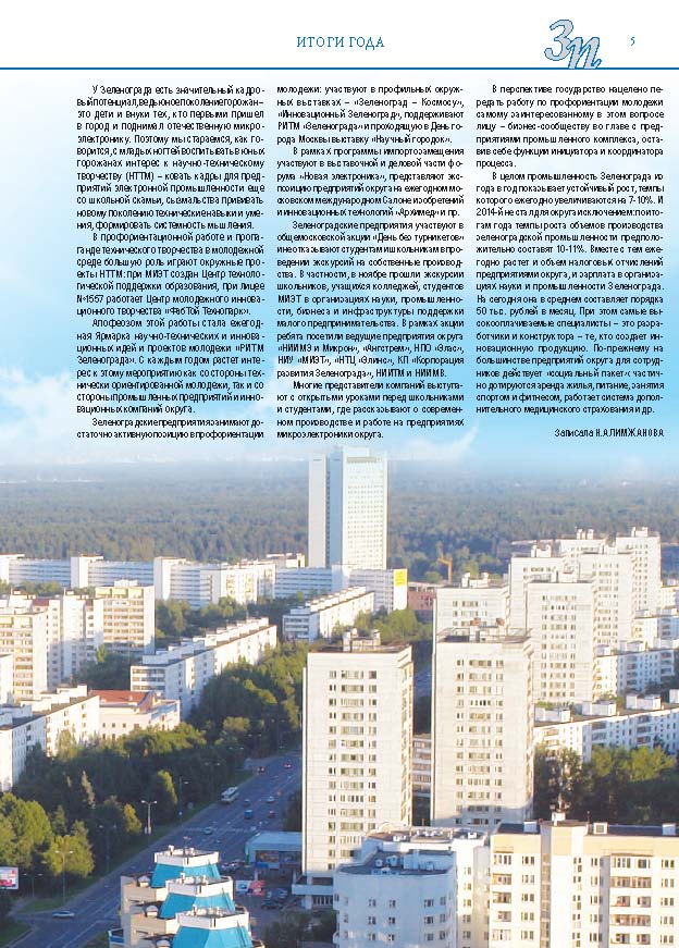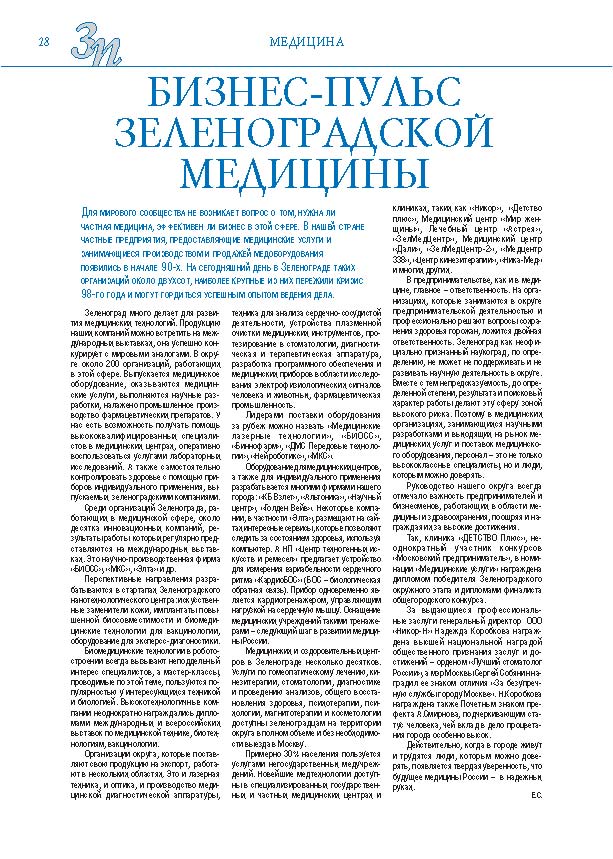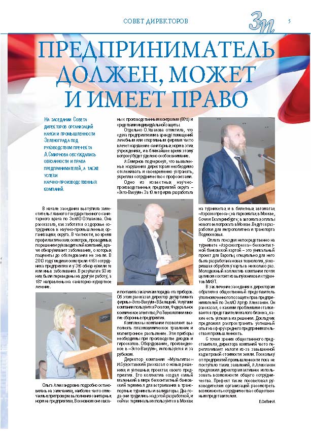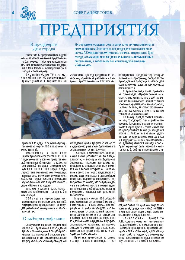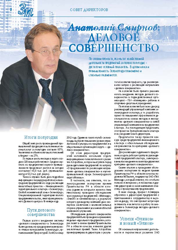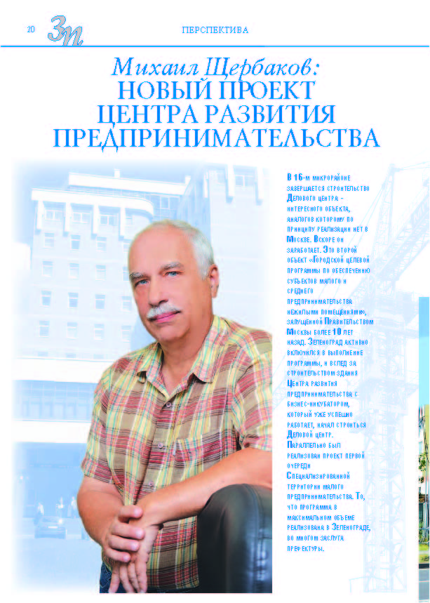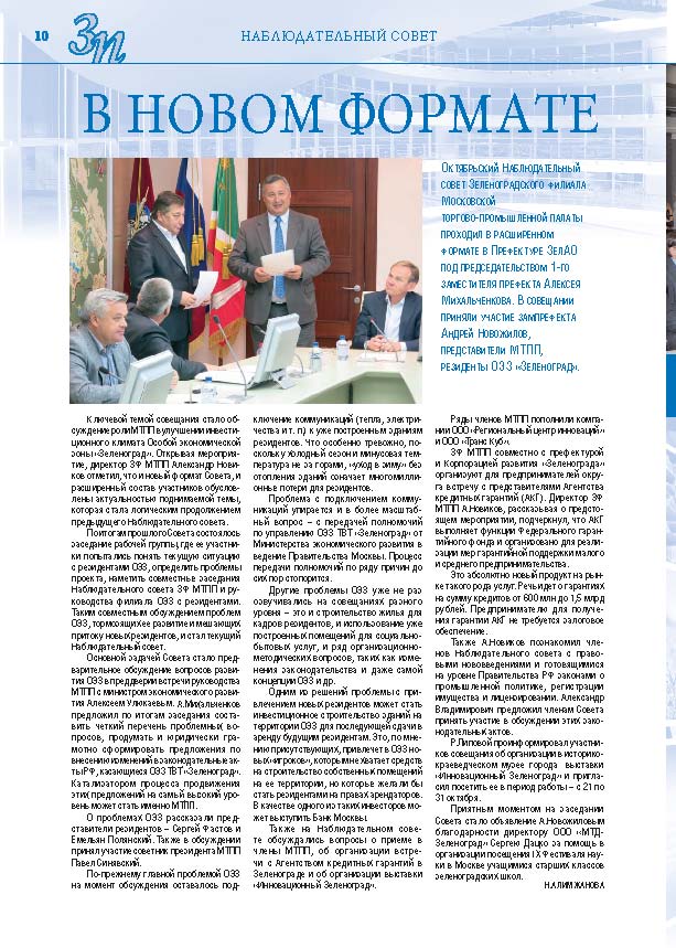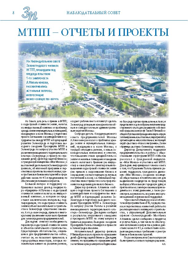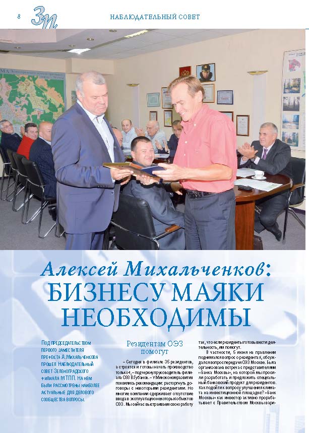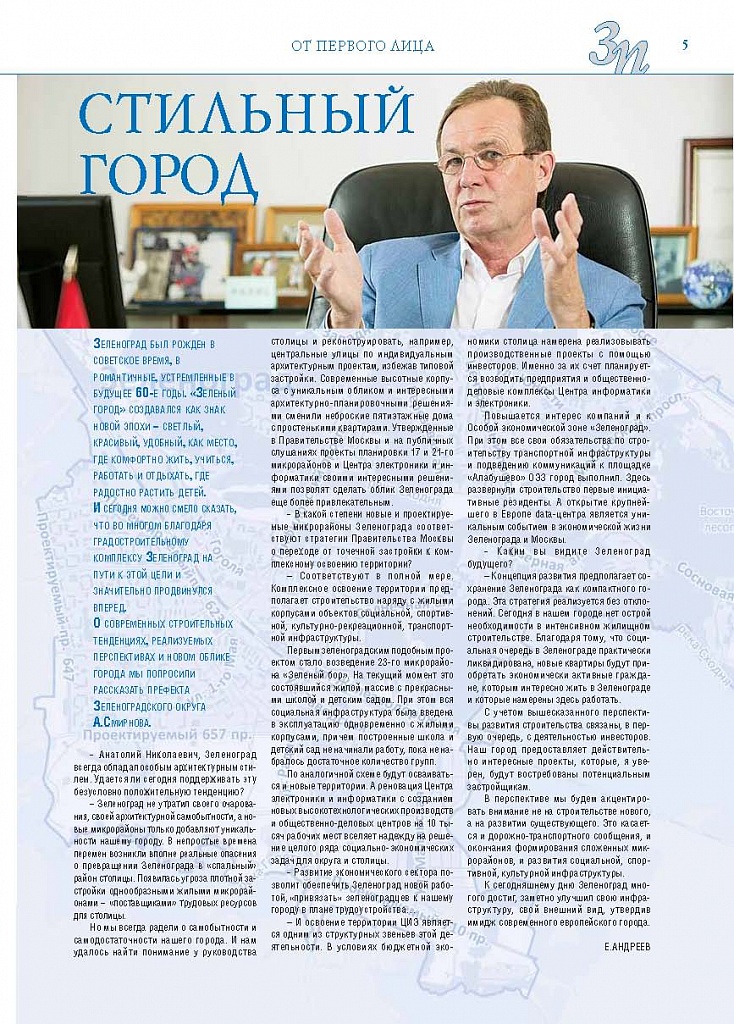 Имиджевое издание, в котором публикуются аналитические статьи и новости зеленоградского бизнеса, а также интервью с предпринимателями округа. Издается при поддержке префектуры ЗелАО с 2005 года. Распространение – префектура ЗелАО, образования самоуправления, ЦРП, Бизнес-центры, крупные бизнес-структуры.