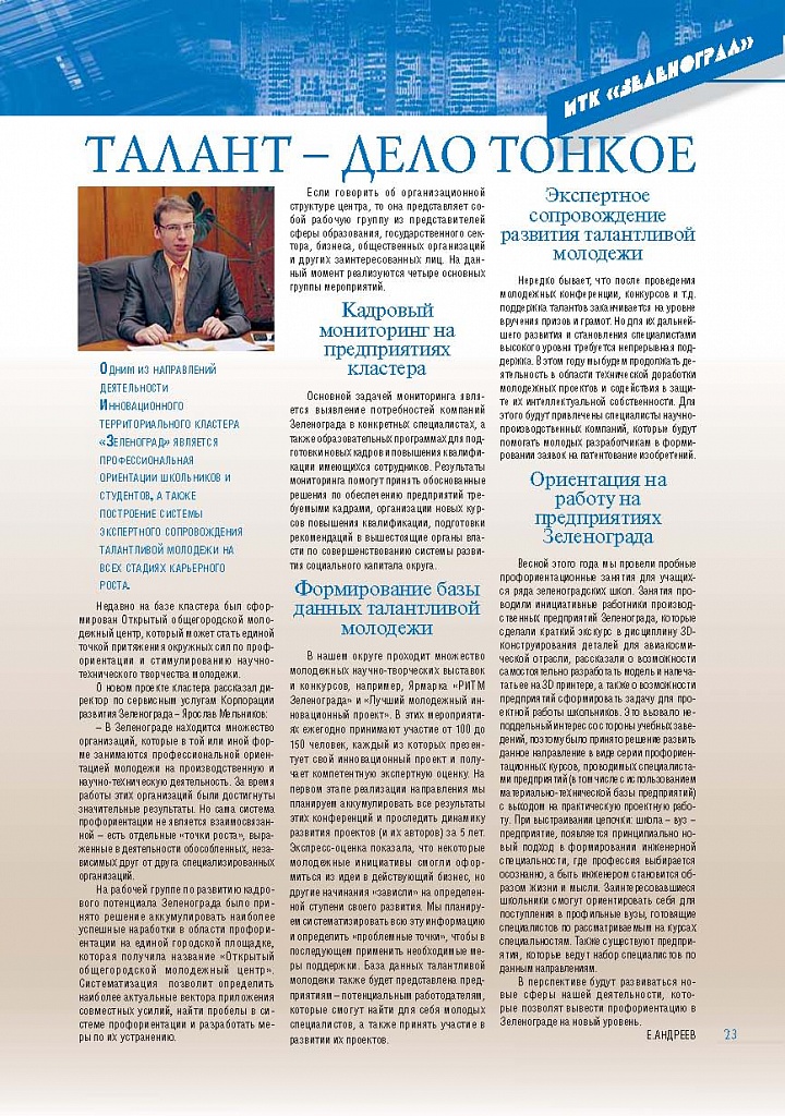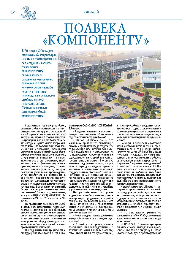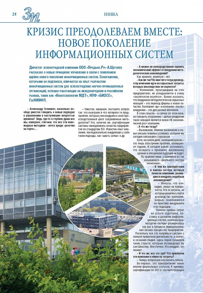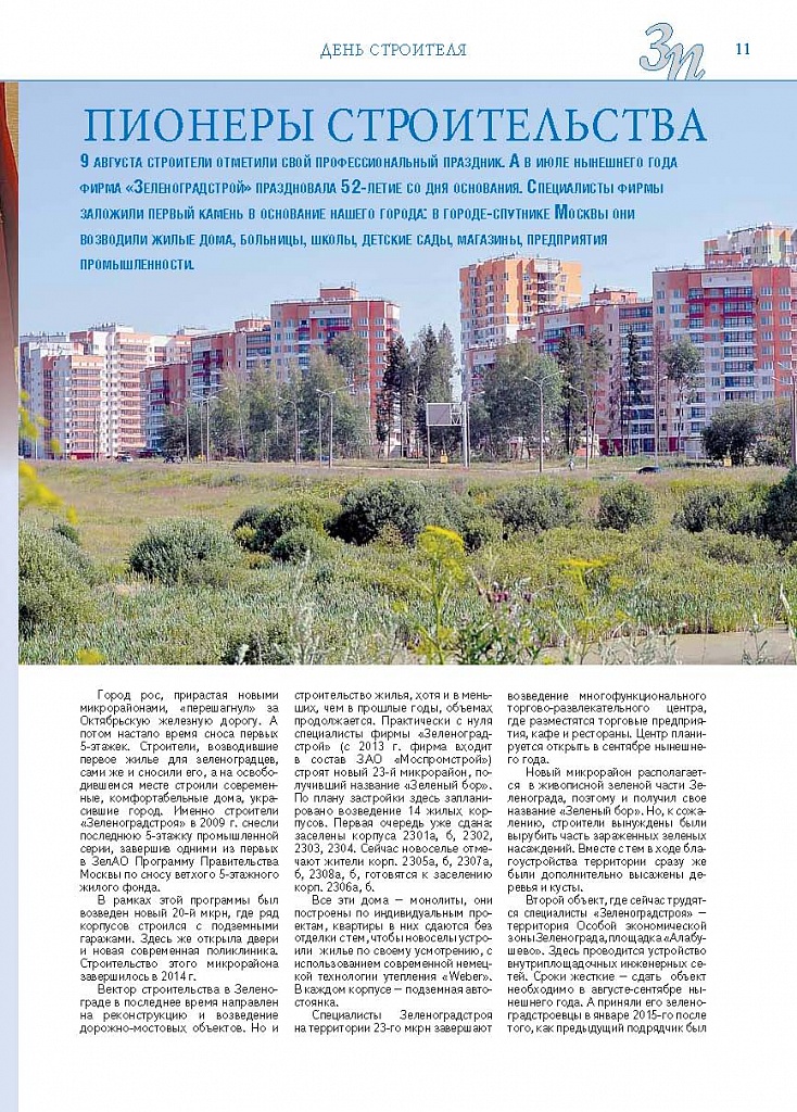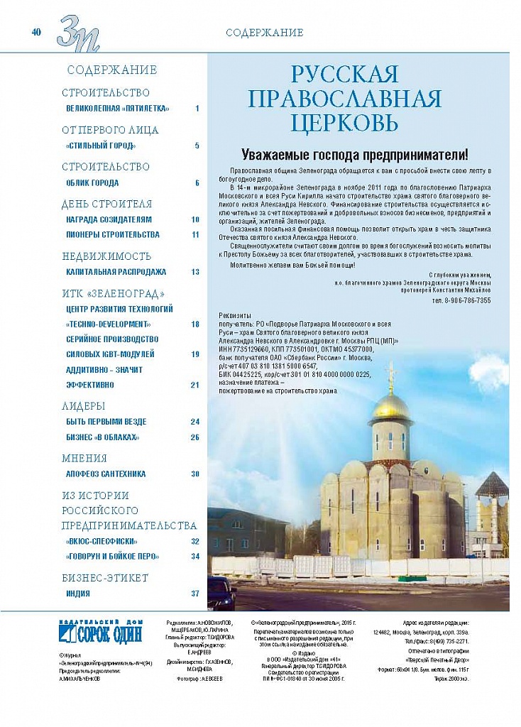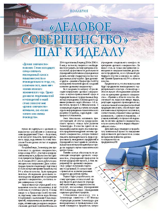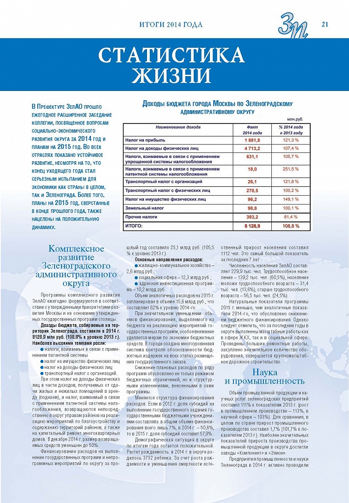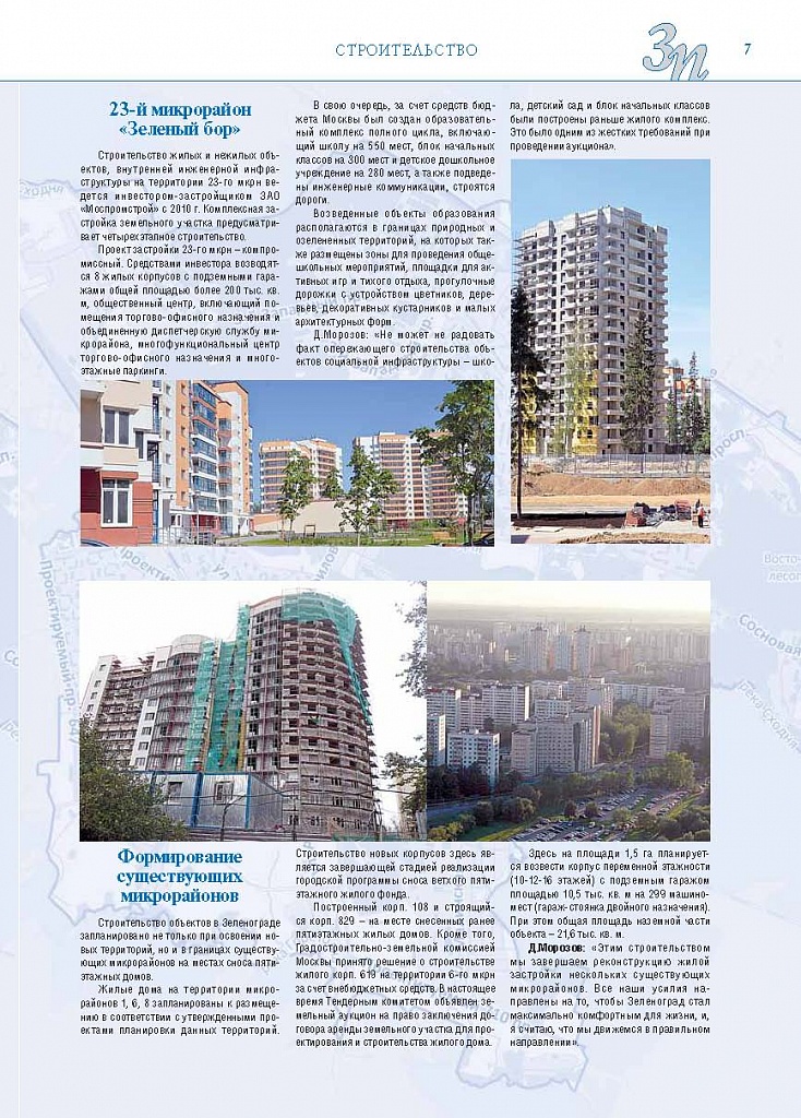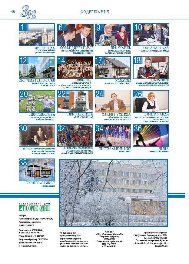 Имиджевое издание, в котором публикуются аналитические статьи и новости зеленоградского бизнеса, а также интервью с предпринимателями округа. Издается при поддержке префектуры ЗелАО с 2005 года. Распространение – префектура ЗелАО, образования самоуправления, ЦРП, Бизнес-центры, крупные бизнес-структуры.