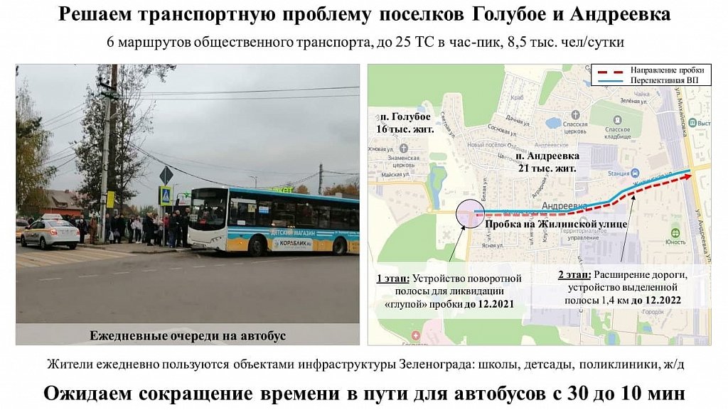 Также городской округ Солнечногорск вошел в число участников пилотного проекта по созданию выделенных полос для общественного транспорта. До конца следующего года в Андреевке расширят саму улицу Жилинская, чтобы создать выделенную полосу для автобусов и маршруток. Это позволит развести потоки автобусов и личных автомобилей, а также сократить время в пути для автобусов с 30 до 10 минут.